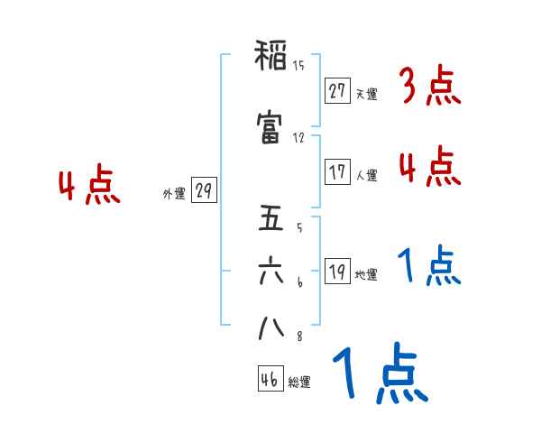 天運![]() | 稲富五六八さんの天運は27画の3つ星!頭脳明晰だが強情で摩擦が多い傾向。孤立に注意。 家系が持つ宿命的な運勢を表します。祖先から受け継いだ苗字ですので自分の力が及びません。家柄を象徴します。 |