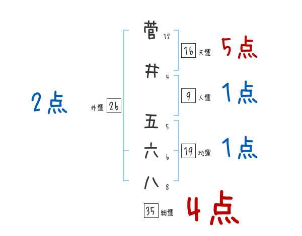 外運![]() | 菅井五六八さんの外運は26画の2つ星!波瀾万丈かも。信頼できる人を大事にしましょう。 生活面を象徴する運勢です。外部から受ける影響力を表し、結婚運、家庭運や職場、環境への順応性を表します。 |