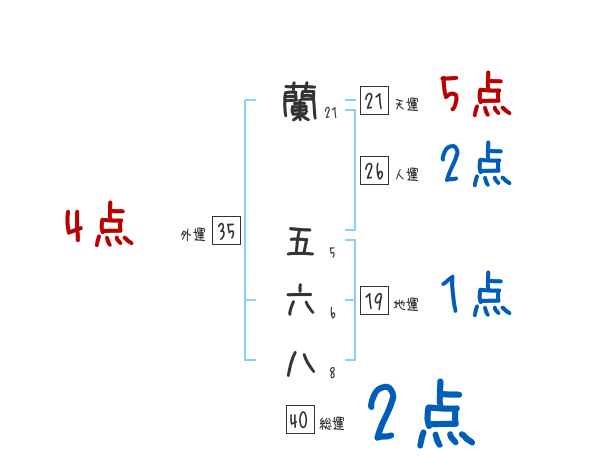 天運![]() | 蘭五六八さんの天運は21画の5つ星!統率力がある。独立し成功する。名誉を手に入れる。 家系が持つ宿命的な運勢を表します。祖先から受け継いだ苗字ですので自分の力が及びません。家柄を象徴します。 |