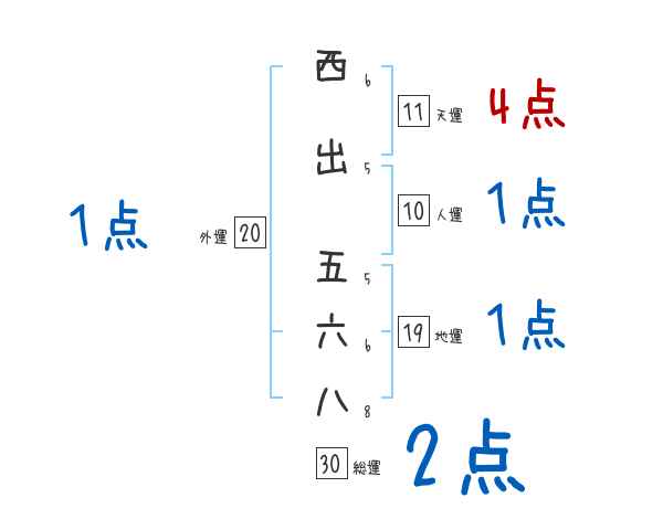 天運![]() | 西出五六八さんの天運は11画の4つ星!着実に富や地位を得る幸運な人生。 家系が持つ宿命的な運勢を表します。祖先から受け継いだ苗字ですので自分の力が及びません。家柄を象徴します。 |