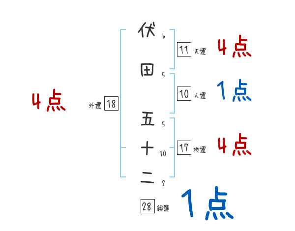 人運![]() | 伏田五十二さんの人運は10画の1つ星!不安を感じやすい傾向。ストレスを抱えないように注意しましょう。 性格や才能などを表す2番目に重要な運勢です。人間関係や協調性、社会的な成功に影響します。主に20歳から50歳ぐらいまでの中年期の運勢を表します。 |