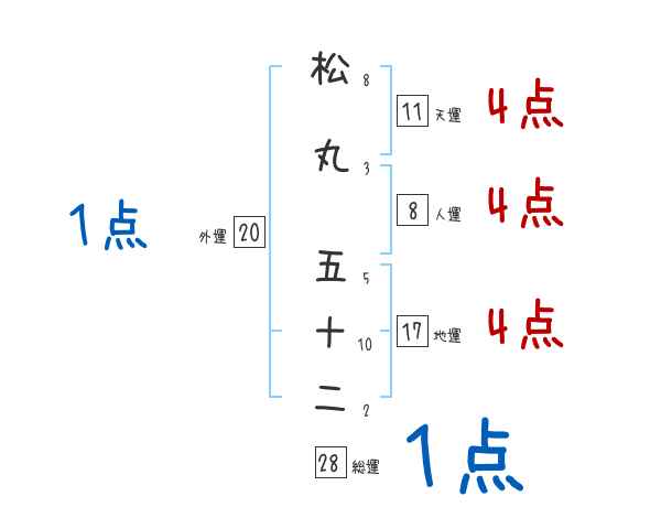 総運![]() | 松丸五十二さんの総運は28画の1つ星!家庭環境に注意。スポーツで活躍できる能力があるかも。 あなたの人生を表す1番重要な運勢です。生涯を通じて影響する総合運となり、主に50歳以降の晩年期に影響を及ぼします。 |