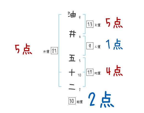 天運![]() | 油井五十二さんの天運は13画の5つ星!才能に恵まれ人気がある。名声を手に入れる。円満な人生。 家系が持つ宿命的な運勢を表します。祖先から受け継いだ苗字ですので自分の力が及びません。家柄を象徴します。 |