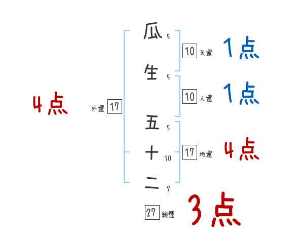 | 外運  | 瓜生五十二さんの外運は17画の4つ星!積極的な行動力。地位を気づき財産を手に入れる。純粋な心と直感力。生活面を象徴する運勢です。外部から受ける影響力を表し、結婚運、家庭運や職場、環境への順応性を表します。 |