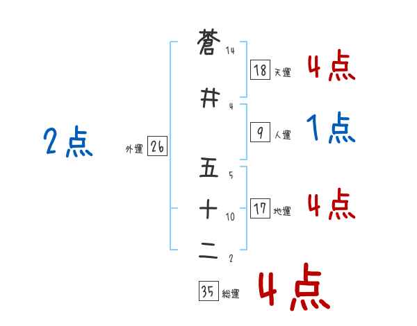 天運![]() | 蒼井五十二さんの天運は18画の4つ星!情熱的で剛気。忍耐力があり信頼される。 家系が持つ宿命的な運勢を表します。祖先から受け継いだ苗字ですので自分の力が及びません。家柄を象徴します。 |