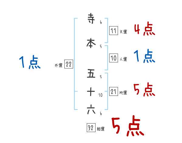 総運![]() | 寺本五十六さんの総運は32画の5つ星!柔軟性があり成功する。チャンスが多く金運が良い。 あなたの人生を表す1番重要な運勢です。生涯を通じて影響する総合運となり、主に50歳以降の晩年期に影響を及ぼします。 |