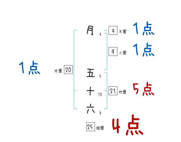 天運![]() | 月五十六さんの天運は4画の1つ星!感情が不安定で苦労するかも。周囲との協調を心掛けましょう。 家系が持つ宿命的な運勢を表します。祖先から受け継いだ苗字ですので自分の力が及びません。家柄を象徴します。 |