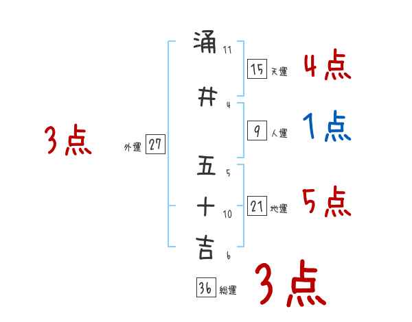 総運![]() | 涌井五十吉さんの総運は36画の3つ星!先見性が豊かです。多少神経質で苦労することも。 あなたの人生を表す1番重要な運勢です。生涯を通じて影響する総合運となり、主に50歳以降の晩年期に影響を及ぼします。 |