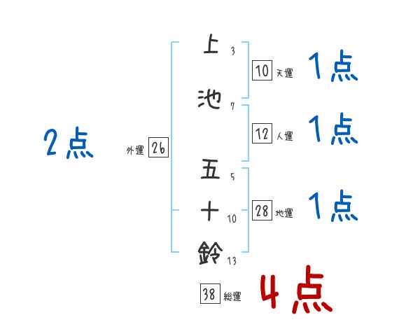 天運![]() | 上池五十鈴さんの天運は10画の1つ星!不安を感じやすい傾向。ストレスを抱えないように注意しましょう。 家系が持つ宿命的な運勢を表します。祖先から受け継いだ苗字ですので自分の力が及びません。家柄を象徴します。 |