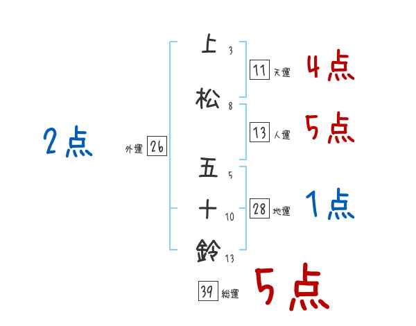 総運![]() | 上松五十鈴さんの総運は39画の5つ星!社交性に優れ人望が厚い。人の上に立ち成功する。 あなたの人生を表す1番重要な運勢です。生涯を通じて影響する総合運となり、主に50歳以降の晩年期に影響を及ぼします。 |