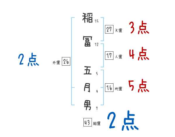 総運![]() | 稲冨五月男さんの総運は43画の2つ星!頑固な性格で独立心が強いかも。やや非現実的で浪費に注意しましょう。 あなたの人生を表す1番重要な運勢です。生涯を通じて影響する総合運となり、主に50歳以降の晩年期に影響を及ぼします。 |