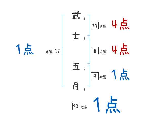 人運![]() | 武士五月さんの人運は8画の4つ星!勤勉家。根気強く努力し成功する。忍耐力がある。 性格や才能などを表す2番目に重要な運勢です。人間関係や協調性、社会的な成功に影響します。主に20歳から50歳ぐらいまでの中年期の運勢を表します。 |