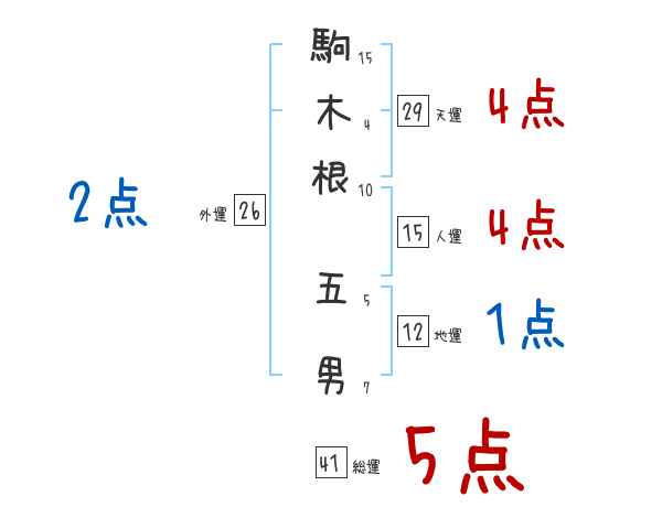 天運![]() | 駒木根五男さんの天運は29画の4つ星!完全主義で才能がある。厳格な心の持ち主。 家系が持つ宿命的な運勢を表します。祖先から受け継いだ苗字ですので自分の力が及びません。家柄を象徴します。 |
