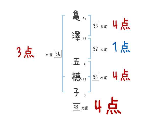 外運![]() | 亀澤五穂子さんの外運は36画の3つ星!先見性が豊かです。多少神経質で苦労することも。 生活面を象徴する運勢です。外部から受ける影響力を表し、結婚運、家庭運や職場、環境への順応性を表します。 |