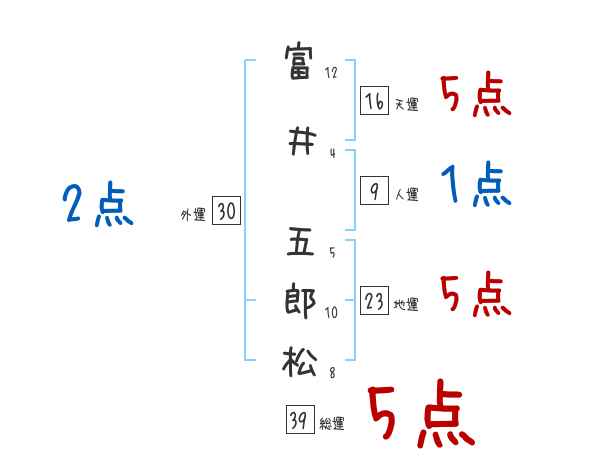 総運![]() | 富井五郎松さんの総運は39画の5つ星!社交性に優れ人望が厚い。人の上に立ち成功する。 あなたの人生を表す1番重要な運勢です。生涯を通じて影響する総合運となり、主に50歳以降の晩年期に影響を及ぼします。 |