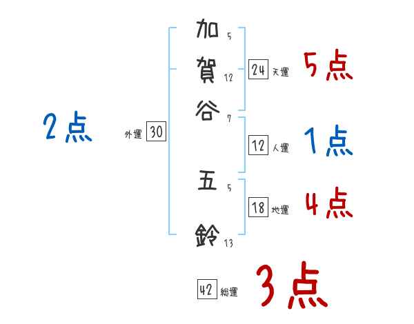 天運![]() | 加賀谷五鈴さんの天運は24画の5つ星!家庭運が良く順調な人生。金運にも恵まれる。 家系が持つ宿命的な運勢を表します。祖先から受け継いだ苗字ですので自分の力が及びません。家柄を象徴します。 |