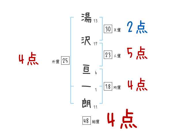 外運![]() | 湯沢亘一朗さんの外運は25画の4つ星!個性があり才能があふれる。強運の持ち主で発展する。 生活面を象徴する運勢です。外部から受ける影響力を表し、結婚運、家庭運や職場、環境への順応性を表します。 |