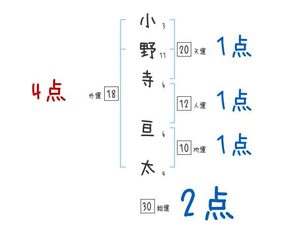 外運![]() | 小野寺亘太さんの外運は18画の4つ星!情熱的で剛気。忍耐力があり信頼される。 生活面を象徴する運勢です。外部から受ける影響力を表し、結婚運、家庭運や職場、環境への順応性を表します。 |