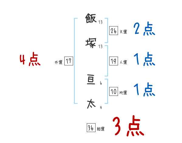 外運![]() | 飯塚亘太さんの外運は17画の4つ星!積極的な行動力。地位を気づき財産を手に入れる。純粋な心と直感力。 生活面を象徴する運勢です。外部から受ける影響力を表し、結婚運、家庭運や職場、環境への順応性を表します。 |