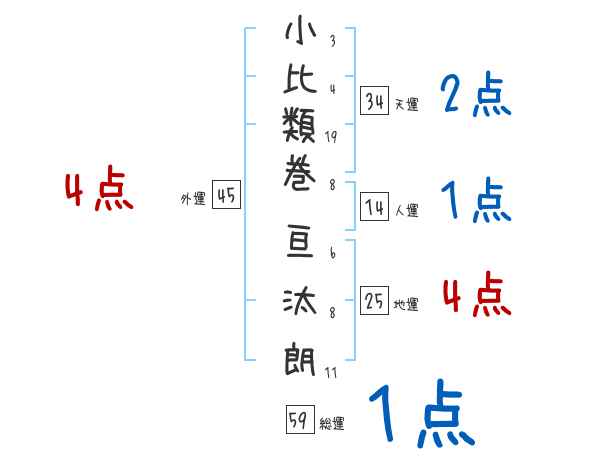 外運![]() | 小比類巻亘汰朗さんの外運は45画の4つ星!もくもくと物事を進め達成する。地味な努力家。 生活面を象徴する運勢です。外部から受ける影響力を表し、結婚運、家庭運や職場、環境への順応性を表します。 |