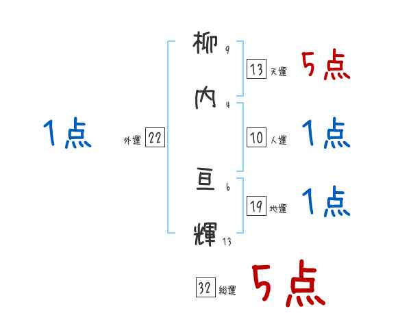 天運![]() | 柳内亘輝さんの天運は13画の5つ星!才能に恵まれ人気がある。名声を手に入れる。円満な人生。 家系が持つ宿命的な運勢を表します。祖先から受け継いだ苗字ですので自分の力が及びません。家柄を象徴します。 |