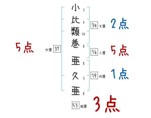 総運![]() | 小比類巻亜久亜さんの総運は53画の3つ星!やや見栄っ張りで虚栄心がある。散財に注意。 あなたの人生を表す1番重要な運勢です。生涯を通じて影響する総合運となり、主に50歳以降の晩年期に影響を及ぼします。 |
