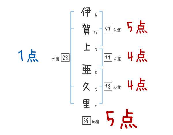 総運![]() | 伊賀上亜久里さんの総運は39画の5つ星!社交性に優れ人望が厚い。人の上に立ち成功する。 あなたの人生を表す1番重要な運勢です。生涯を通じて影響する総合運となり、主に50歳以降の晩年期に影響を及ぼします。 |