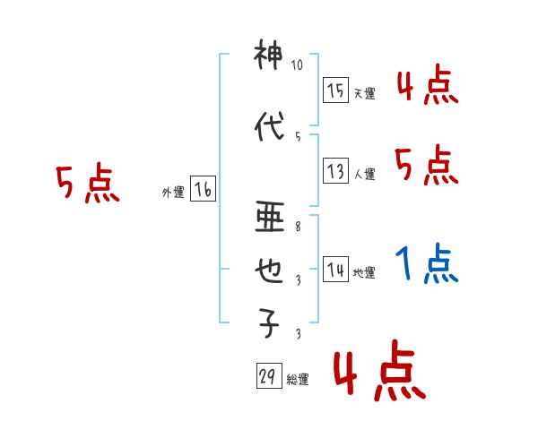 外運![]() | 神代亜也子さんの外運は16画の5つ星!人望が厚く大きく発展する。逆転成功が見える。 生活面を象徴する運勢です。外部から受ける影響力を表し、結婚運、家庭運や職場、環境への順応性を表します。 |