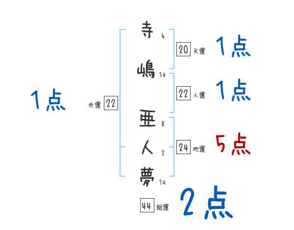 人運![]() | 寺嶋亜人夢さんの人運は22画の1つ星!努力することが苦手ないっぽう手先が器用。芸術性にも優れる。 性格や才能などを表す2番目に重要な運勢です。人間関係や協調性、社会的な成功に影響します。主に20歳から50歳ぐらいまでの中年期の運勢を表します。 |