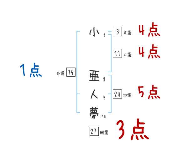 天運![]() | 小亜人夢さんの天運は3画の4つ星!活動的で才能に恵まれ、多くの信頼を得る。希望に満ち成長する。 家系が持つ宿命的な運勢を表します。祖先から受け継いだ苗字ですので自分の力が及びません。家柄を象徴します。 |