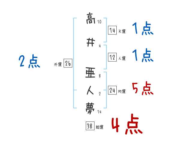 外運![]() | 高井亜人夢さんの外運は26画の2つ星!波瀾万丈かも。信頼できる人を大事にしましょう。 生活面を象徴する運勢です。外部から受ける影響力を表し、結婚運、家庭運や職場、環境への順応性を表します。 |