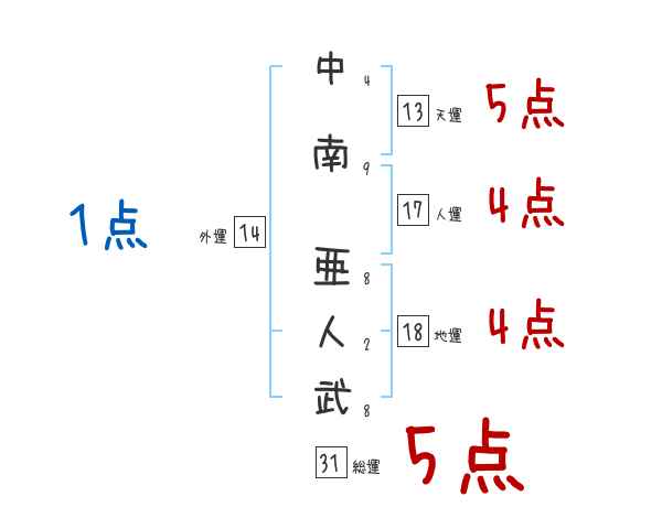 総運![]() | 中南亜人武さんの総運は31画の5つ星!社交性があり判断力に優れる。順風満帆な人生で円満な生活。 あなたの人生を表す1番重要な運勢です。生涯を通じて影響する総合運となり、主に50歳以降の晩年期に影響を及ぼします。 |