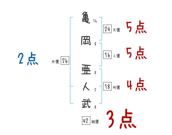 外運![]() | 亀岡亜人武さんの外運は26画の2つ星!波瀾万丈かも。信頼できる人を大事にしましょう。 生活面を象徴する運勢です。外部から受ける影響力を表し、結婚運、家庭運や職場、環境への順応性を表します。 |