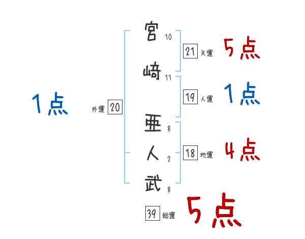 天運![]() | 宮﨑亜人武さんの天運は21画の5つ星!統率力がある。独立し成功する。名誉を手に入れる。 家系が持つ宿命的な運勢を表します。祖先から受け継いだ苗字ですので自分の力が及びません。家柄を象徴します。 |