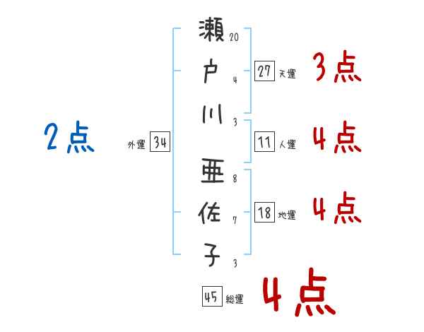 総運![]() | 瀬戸川亜佐子さんの総運は45画の4つ星!もくもくと物事を進め達成する。地味な努力家。 あなたの人生を表す1番重要な運勢です。生涯を通じて影響する総合運となり、主に50歳以降の晩年期に影響を及ぼします。 |