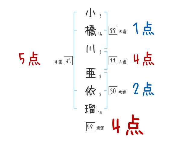 外運![]() | 小橋川亜依瑠さんの外運は41画の5つ星!大志を抱き、目標に向かって実力を発揮し達成する。温和な性格。 生活面を象徴する運勢です。外部から受ける影響力を表し、結婚運、家庭運や職場、環境への順応性を表します。 |