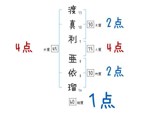 天運![]() | 渡真利亜依瑠さんの天運は30画の2つ星!浮き沈みの激しさに注意しましょう。 家系が持つ宿命的な運勢を表します。祖先から受け継いだ苗字ですので自分の力が及びません。家柄を象徴します。 |