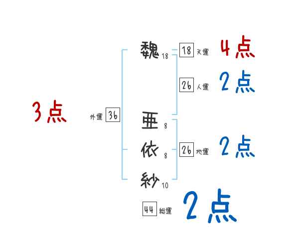 外運![]() | 魏亜依紗さんの外運は36画の3つ星!先見性が豊かです。多少神経質で苦労することも。 生活面を象徴する運勢です。外部から受ける影響力を表し、結婚運、家庭運や職場、環境への順応性を表します。 |