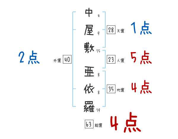天運![]() | 中屋敷亜依羅さんの天運は28画の1つ星!家庭環境に注意。スポーツで活躍できる能力があるかも。 家系が持つ宿命的な運勢を表します。祖先から受け継いだ苗字ですので自分の力が及びません。家柄を象徴します。 |