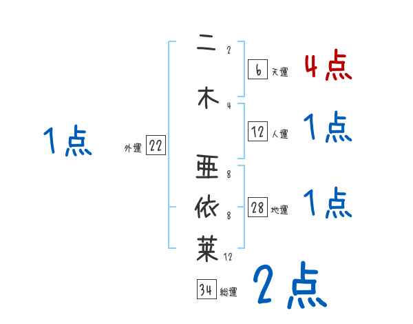 総運![]() | 二木亜依莱さんの総運は34画の2つ星!独創性に優れるが、自尊心が強く災難に注意しましょう。 あなたの人生を表す1番重要な運勢です。生涯を通じて影響する総合運となり、主に50歳以降の晩年期に影響を及ぼします。 |