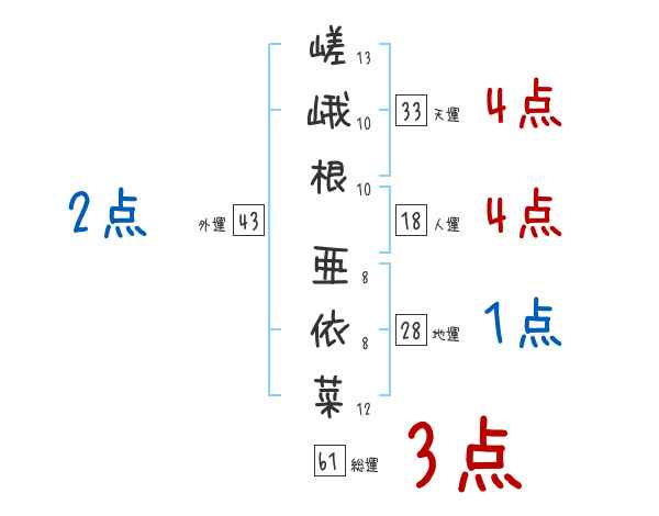 総運![]() | 嵯峨根亜依菜さんの総運は61画の3つ星!強情な性格でうぬぼれタイプ。自ら破滅する。 あなたの人生を表す1番重要な運勢です。生涯を通じて影響する総合運となり、主に50歳以降の晩年期に影響を及ぼします。 |