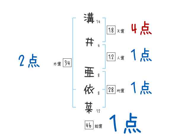 天運![]() | 溝井亜依菜さんの天運は18画の4つ星!情熱的で剛気。忍耐力があり信頼される。 家系が持つ宿命的な運勢を表します。祖先から受け継いだ苗字ですので自分の力が及びません。家柄を象徴します。 |