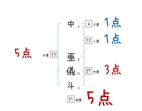 外運![]() | 中亜儀斗さんの外運は23画の5つ星!想像力に優れ活力がある。一代で成功し名誉を手に入れる。 生活面を象徴する運勢です。外部から受ける影響力を表し、結婚運、家庭運や職場、環境への順応性を表します。 |