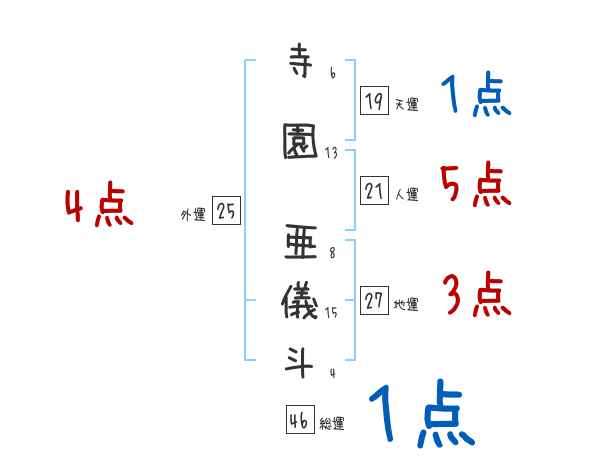 天運![]() | 寺園亜儀斗さんの天運は19画の1つ星!優れた才能を持ちますが、協調性が足りないことも。周りの人と協力する事を意識しましょう。 家系が持つ宿命的な運勢を表します。祖先から受け継いだ苗字ですので自分の力が及びません。家柄を象徴します。 |