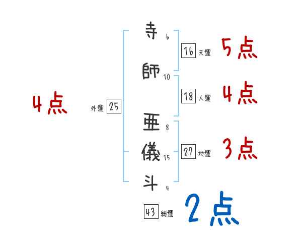 天運![]() | 寺師亜儀斗さんの天運は16画の5つ星!人望が厚く大きく発展する。逆転成功が見える。 家系が持つ宿命的な運勢を表します。祖先から受け継いだ苗字ですので自分の力が及びません。家柄を象徴します。 |