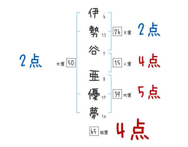 天運![]() | 伊勢谷亜優夢さんの天運は26画の2つ星!波瀾万丈かも。信頼できる人を大事にしましょう。 家系が持つ宿命的な運勢を表します。祖先から受け継いだ苗字ですので自分の力が及びません。家柄を象徴します。 |
