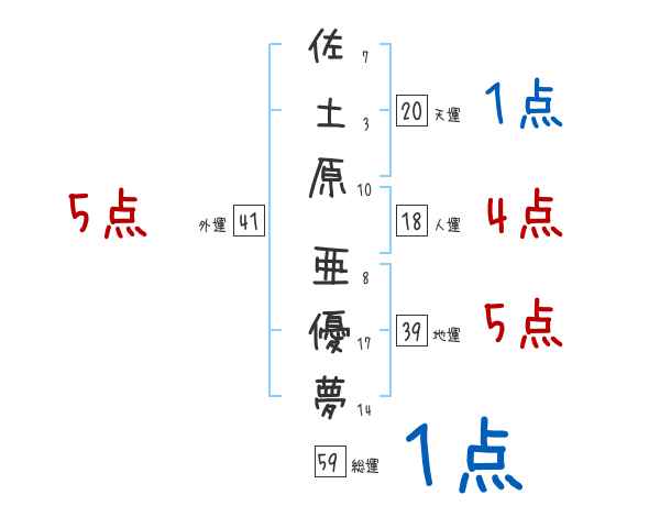 総運![]() | 佐土原亜優夢さんの総運は59画の1つ星!意志の弱さであきらめることが多いかも。粘り強さが必要。 あなたの人生を表す1番重要な運勢です。生涯を通じて影響する総合運となり、主に50歳以降の晩年期に影響を及ぼします。 |