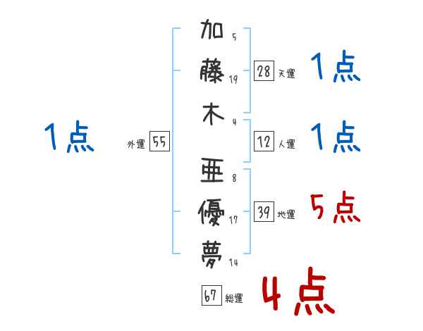 天運![]() | 加藤木亜優夢さんの天運は28画の1つ星!家庭環境に注意。スポーツで活躍できる能力があるかも。 家系が持つ宿命的な運勢を表します。祖先から受け継いだ苗字ですので自分の力が及びません。家柄を象徴します。 |