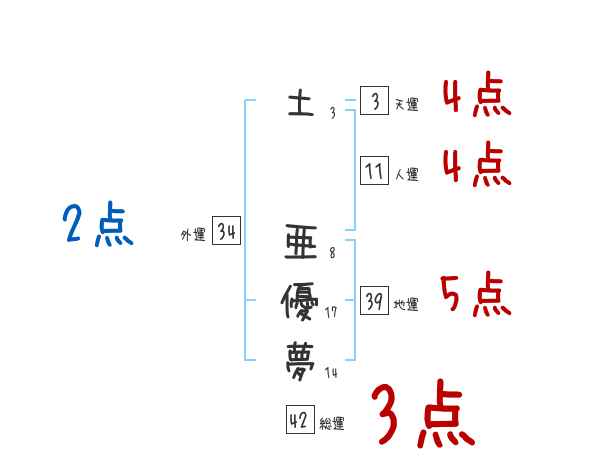 天運![]() | 土亜優夢さんの天運は3画の4つ星!活動的で才能に恵まれ、多くの信頼を得る。希望に満ち成長する。 家系が持つ宿命的な運勢を表します。祖先から受け継いだ苗字ですので自分の力が及びません。家柄を象徴します。 |