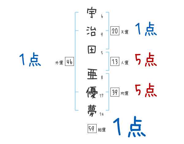 総運![]() | 宇治田亜優夢さんの総運は59画の1つ星!意志の弱さであきらめることが多いかも。粘り強さが必要。 あなたの人生を表す1番重要な運勢です。生涯を通じて影響する総合運となり、主に50歳以降の晩年期に影響を及ぼします。 |